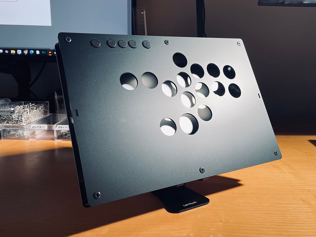 本体フレームは金属角柱・アルミ版及びFR-4版を主とし絶対的強度を目指す。天板はアクリル素材。底板はマグネット開閉式。